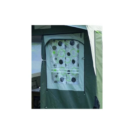 Apertura e chiusura completa sul davanti con cerniera. I due lati e la parte posteriore sono dotati di ampie finestre con zanzariere. Le pareti sono in poliestere traspirante. Questi elementi conferiscono una struttura solida, resistente e molto leggera. Misura 200×150
