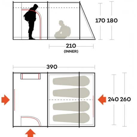 Accessori: Distanza del doppio tetto dalla base regolabile, per ottimale tensionamento. Pavimento su porta frontale apribile. Camera separata da divisorio amovibile. Apertura su doppio tetto per il passaggio dei cavi elettrici. Sistema di tiranti per fissare la tenda, multipoint per una maggiore resistenza strutturale in caso di forte vento. Gancio interno porta lampada. Ampia borsa a custodia in Supertex. Kit di riparazione. Istruzioni video per il montaggio attivabili con QRCode.