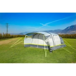 Ingresso e aerazione: Absidi, Porte con zanzariera esterna completamente apribili e riponibili in apposito taschino. Sistema di ventilazione “Air Ventilation System” con ampia zanzariera. Cuffie di ventilazione. Falda a terra, che garantisce un’ottimale aerazione quando è arrotolata e protegge l’interno della tenda in caso di cattivo tempo, se srotolata